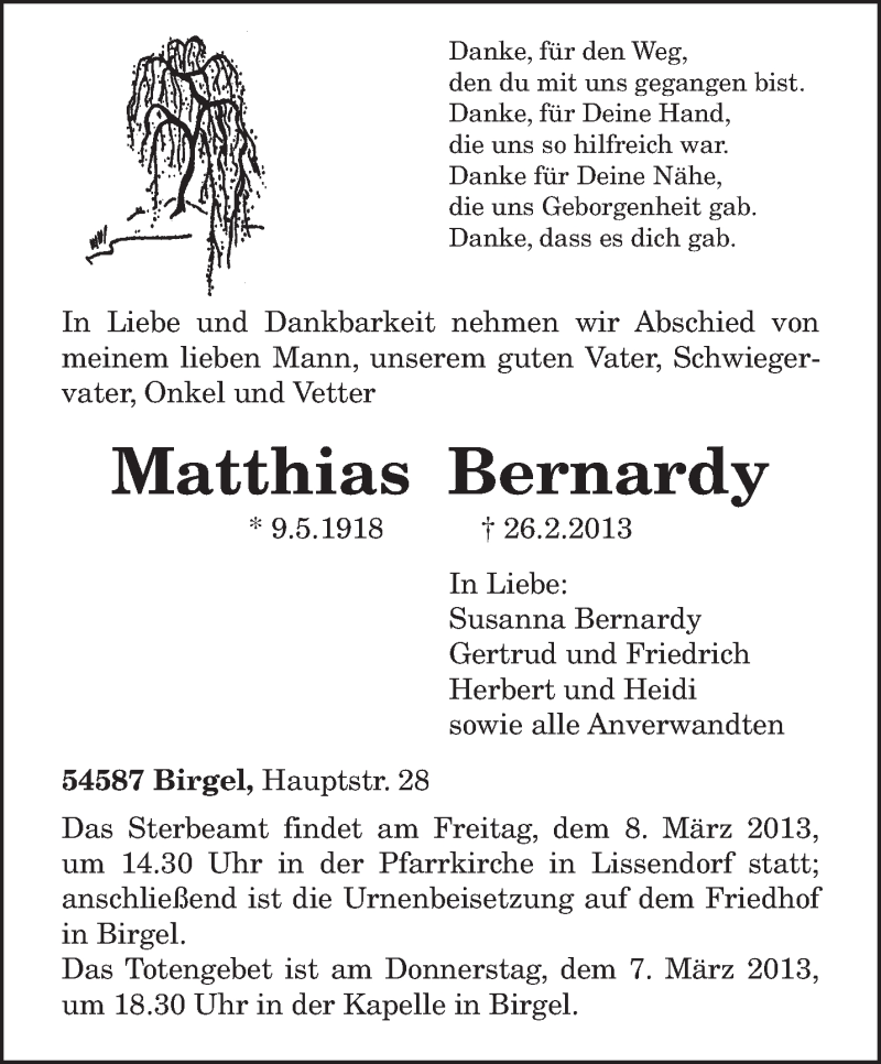 Hier finden Sie alle Traueranzeigen aus der Zeitung, die bisher für Matthias Bernardy erschienen sind. Weitere Traueranzeigen, die in der Zeitung erscheinen, werden hier ebenfalls aufgelistet