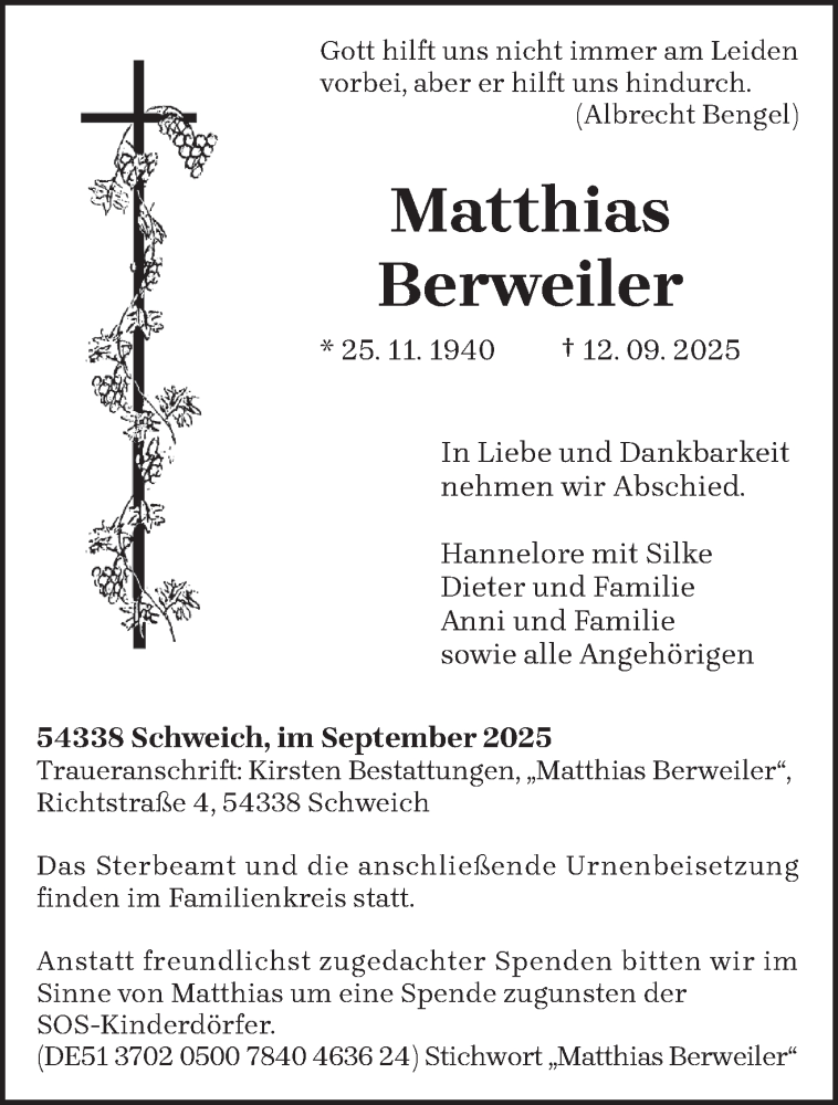 Hier finden Sie alle Traueranzeigen aus der Zeitung, die bisher für Matthias Berweiler erschienen sind. Weitere Traueranzeigen, die in der Zeitung erscheinen, werden hier ebenfalls aufgelistet