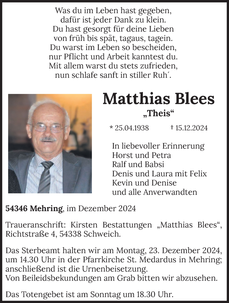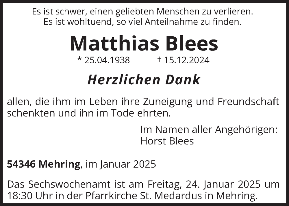 Hier finden Sie alle Traueranzeigen aus der Zeitung, die bisher für Matthias Blees erschienen sind. Weitere Traueranzeigen, die in der Zeitung erscheinen, werden hier ebenfalls aufgelistet