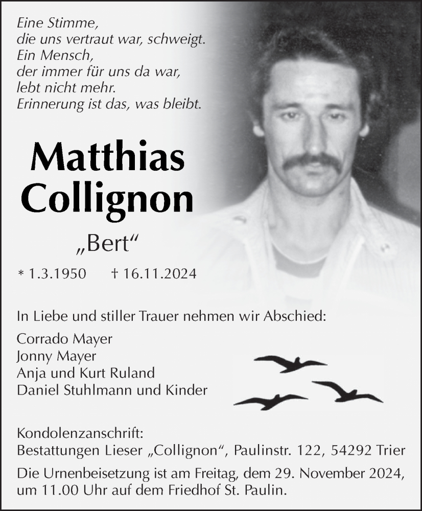 Hier finden Sie alle Traueranzeigen aus der Zeitung, die bisher für Matthias Collignon erschienen sind. Weitere Traueranzeigen, die in der Zeitung erscheinen, werden hier ebenfalls aufgelistet