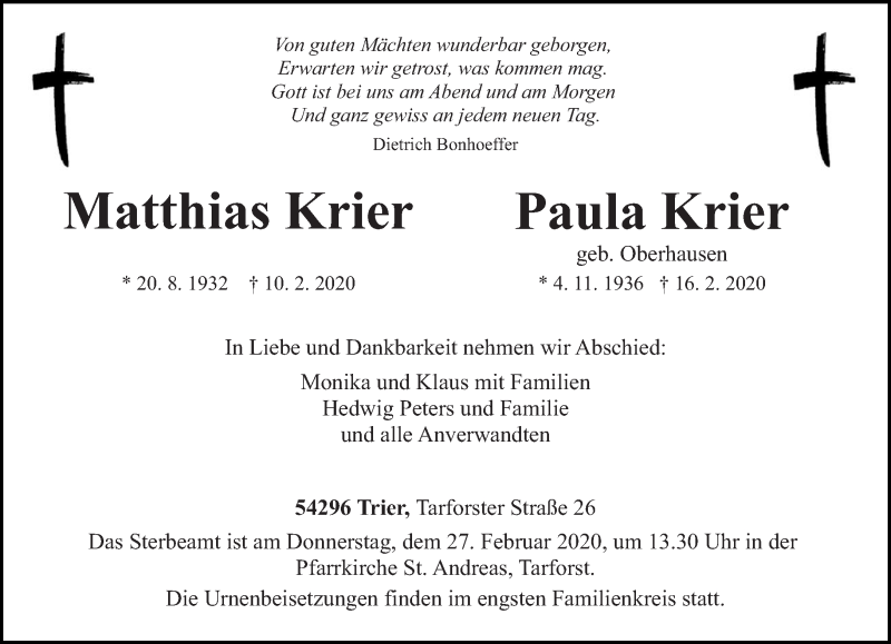 Hier finden Sie alle Traueranzeigen aus der Zeitung, die bisher für Matthias und Paula Krier erschienen sind. Weitere Traueranzeigen, die in der Zeitung erscheinen, werden hier ebenfalls aufgelistet