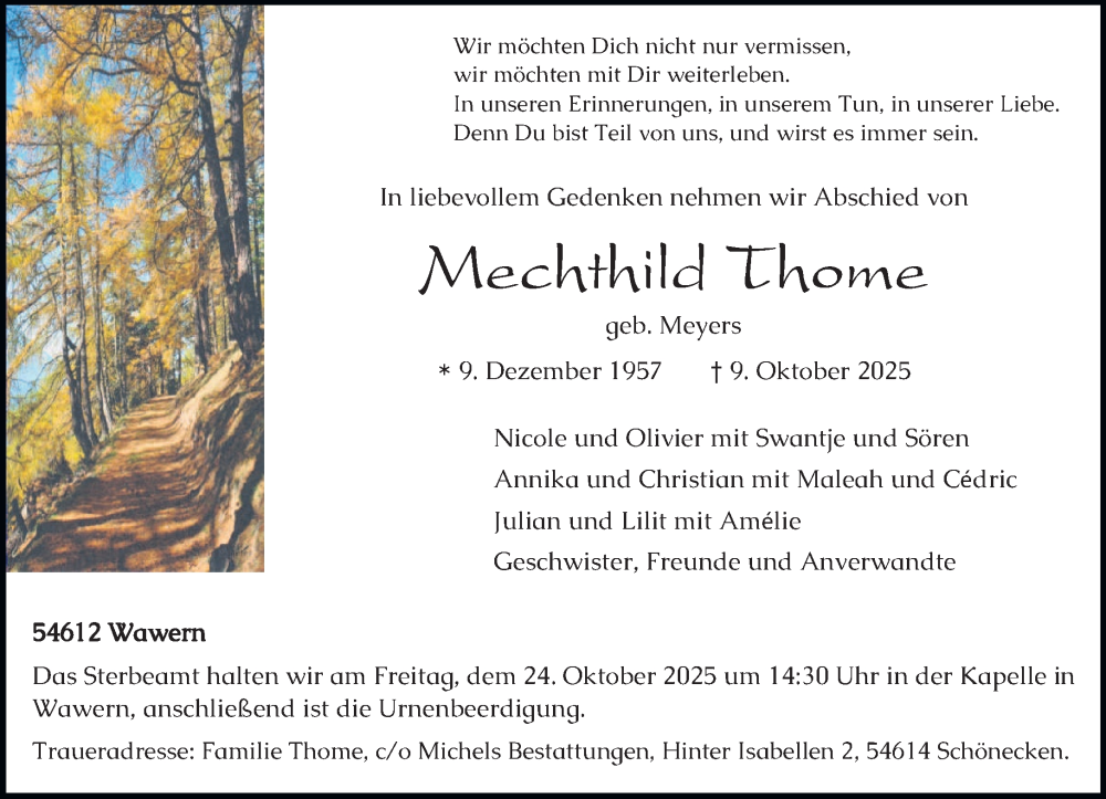 Hier finden Sie alle Traueranzeigen aus der Zeitung, die bisher für Mechthild Thome erschienen sind. Weitere Traueranzeigen, die in der Zeitung erscheinen, werden hier ebenfalls aufgelistet