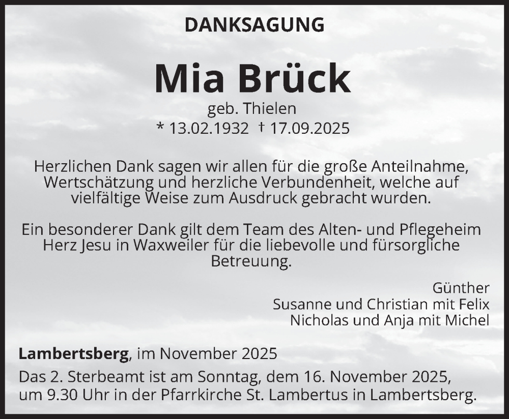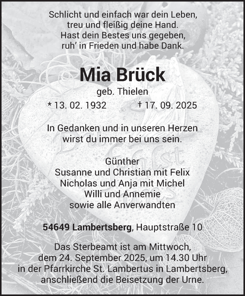 Hier finden Sie alle Traueranzeigen aus der Zeitung, die bisher für Mia Brück erschienen sind. Weitere Traueranzeigen, die in der Zeitung erscheinen, werden hier ebenfalls aufgelistet