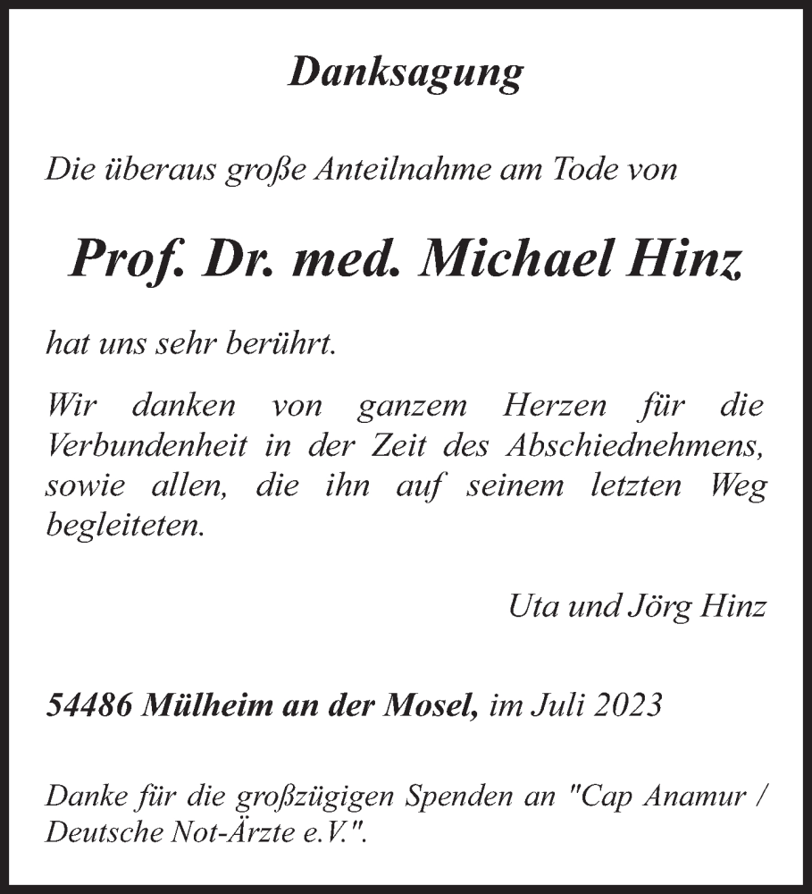 Hier finden Sie alle Traueranzeigen aus der Zeitung, die bisher für Michael Hinz erschienen sind. Weitere Traueranzeigen, die in der Zeitung erscheinen, werden hier ebenfalls aufgelistet