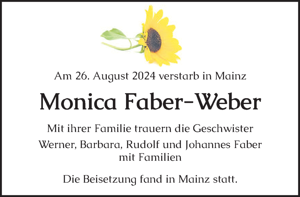 Hier finden Sie alle Traueranzeigen aus der Zeitung, die bisher für Monica Faber-Weber erschienen sind. Weitere Traueranzeigen, die in der Zeitung erscheinen, werden hier ebenfalls aufgelistet