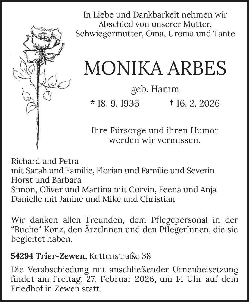 Hier finden Sie alle Traueranzeigen aus der Zeitung, die bisher für Monika Arbes erschienen sind. Weitere Traueranzeigen, die in der Zeitung erscheinen, werden hier ebenfalls aufgelistet