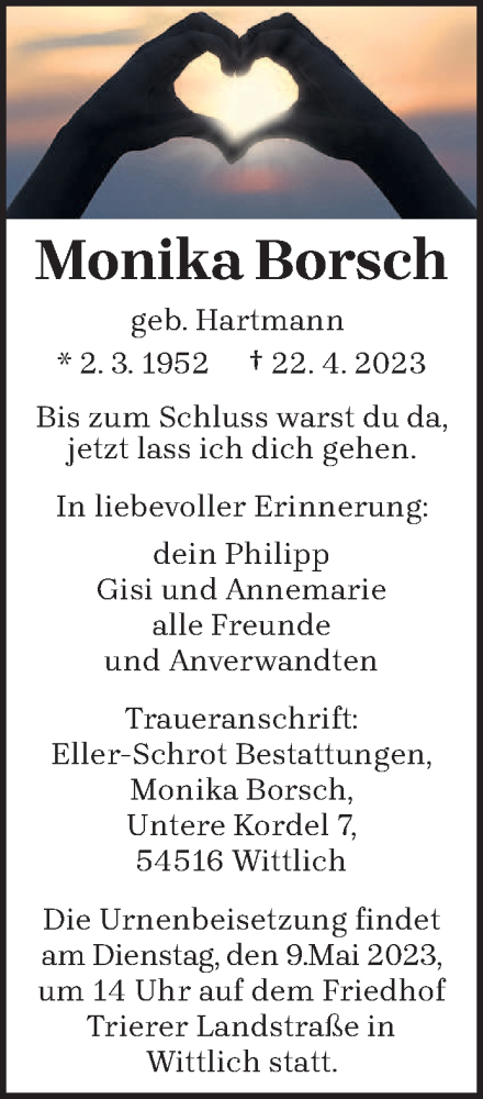 Hier finden Sie alle Traueranzeigen aus der Zeitung, die bisher für Monika Borsch erschienen sind. Weitere Traueranzeigen, die in der Zeitung erscheinen, werden hier ebenfalls aufgelistet