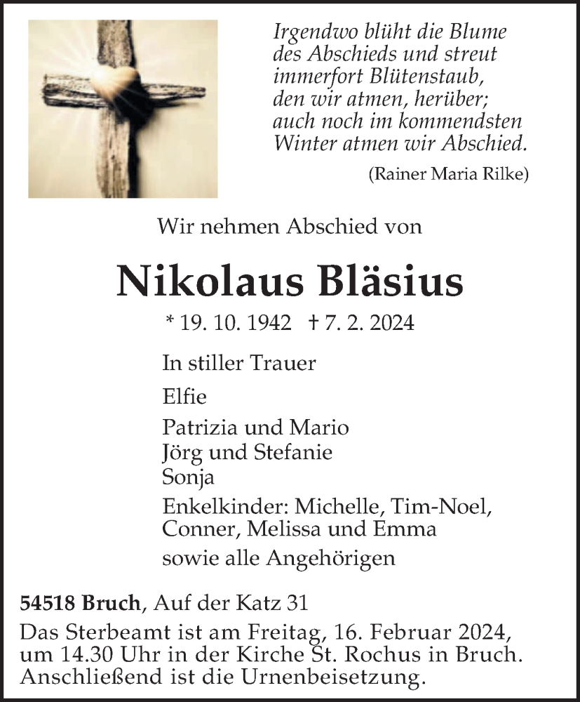 Hier finden Sie alle Traueranzeigen aus der Zeitung, die bisher für Nikolaus Bläsius erschienen sind. Weitere Traueranzeigen, die in der Zeitung erscheinen, werden hier ebenfalls aufgelistet