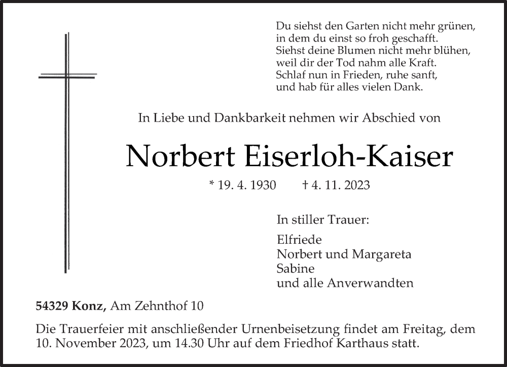 Hier finden Sie alle Traueranzeigen aus der Zeitung, die bisher für Norbert Eiserloh-Kaiser erschienen sind. Weitere Traueranzeigen, die in der Zeitung erscheinen, werden hier ebenfalls aufgelistet