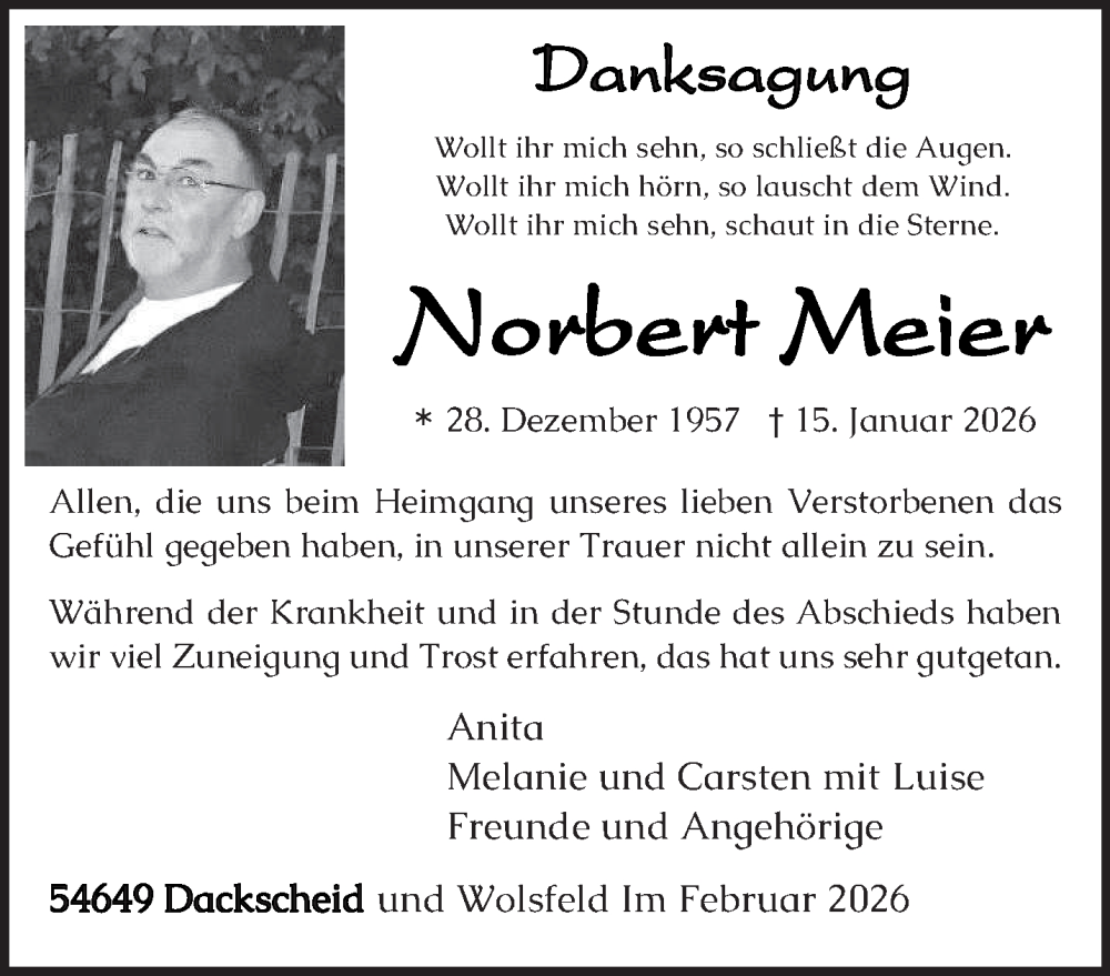 Hier finden Sie alle Traueranzeigen aus der Zeitung, die bisher für Norbert Meier erschienen sind. Weitere Traueranzeigen, die in der Zeitung erscheinen, werden hier ebenfalls aufgelistet