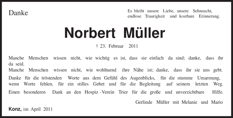 Hier finden Sie alle Traueranzeigen aus der Zeitung, die bisher für Norbert Müller erschienen sind. Weitere Traueranzeigen, die in der Zeitung erscheinen, werden hier ebenfalls aufgelistet