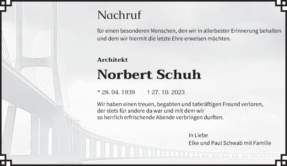 Hier finden Sie alle Traueranzeigen aus der Zeitung, die bisher für Norbert Schuh erschienen sind. Weitere Traueranzeigen, die in der Zeitung erscheinen, werden hier ebenfalls aufgelistet