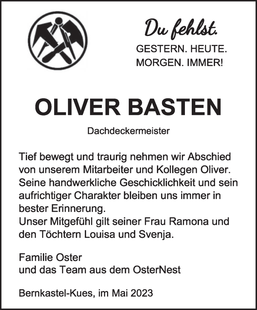 Hier finden Sie alle Traueranzeigen aus der Zeitung, die bisher für Oliver Basten erschienen sind. Weitere Traueranzeigen, die in der Zeitung erscheinen, werden hier ebenfalls aufgelistet