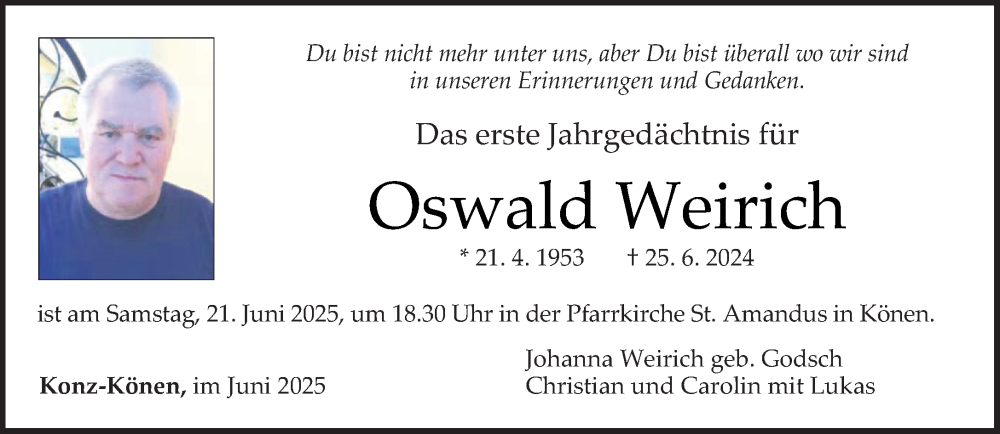 Hier finden Sie alle Traueranzeigen aus der Zeitung, die bisher für Oswald Weirich erschienen sind. Weitere Traueranzeigen, die in der Zeitung erscheinen, werden hier ebenfalls aufgelistet