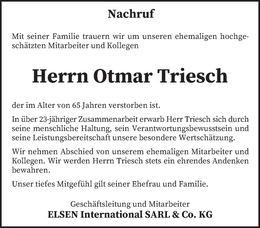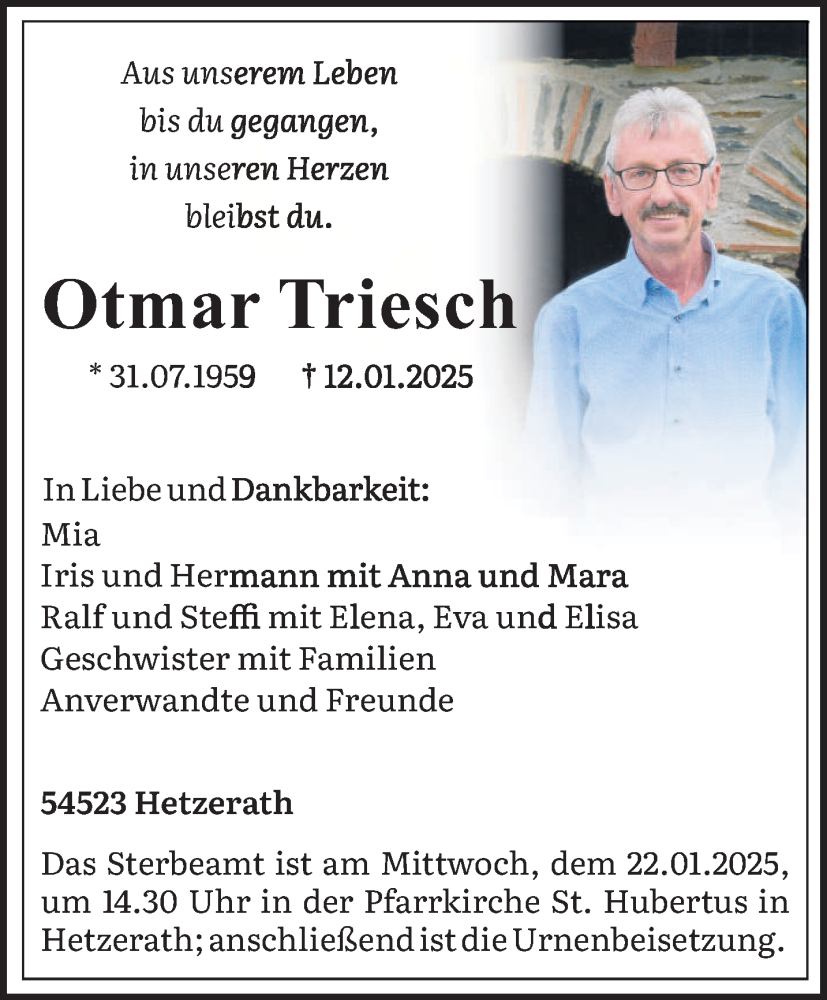 Hier finden Sie alle Traueranzeigen aus der Zeitung, die bisher für Otmar Triesch erschienen sind. Weitere Traueranzeigen, die in der Zeitung erscheinen, werden hier ebenfalls aufgelistet