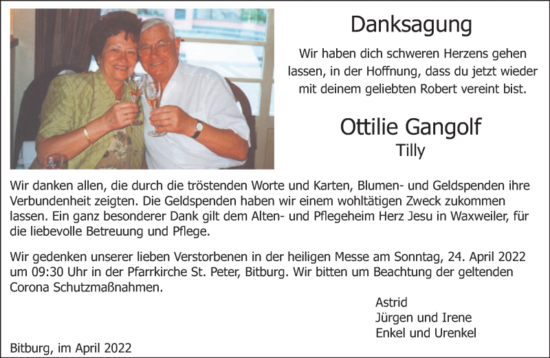 Hier finden Sie alle Traueranzeigen aus der Zeitung, die bisher für Ottilie Gangolf erschienen sind. Weitere Traueranzeigen, die in der Zeitung erscheinen, werden hier ebenfalls aufgelistet