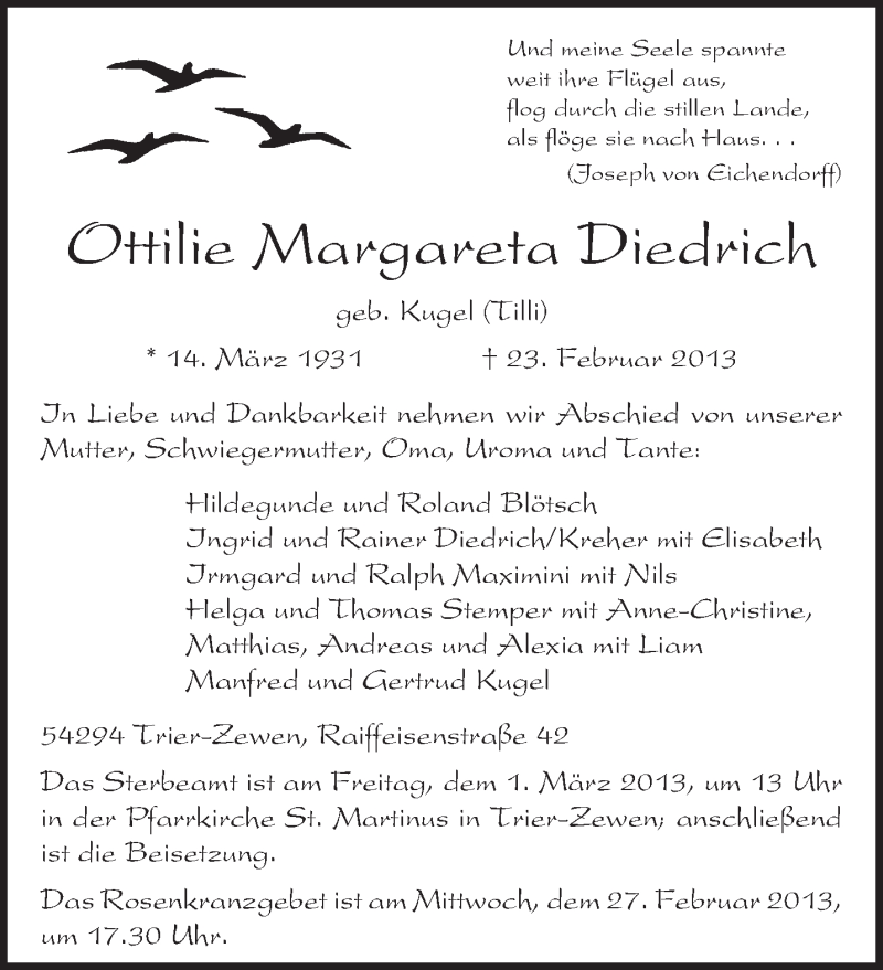 Hier finden Sie alle Traueranzeigen aus der Zeitung, die bisher für Ottilie Margareta Diedrich erschienen sind. Weitere Traueranzeigen, die in der Zeitung erscheinen, werden hier ebenfalls aufgelistet