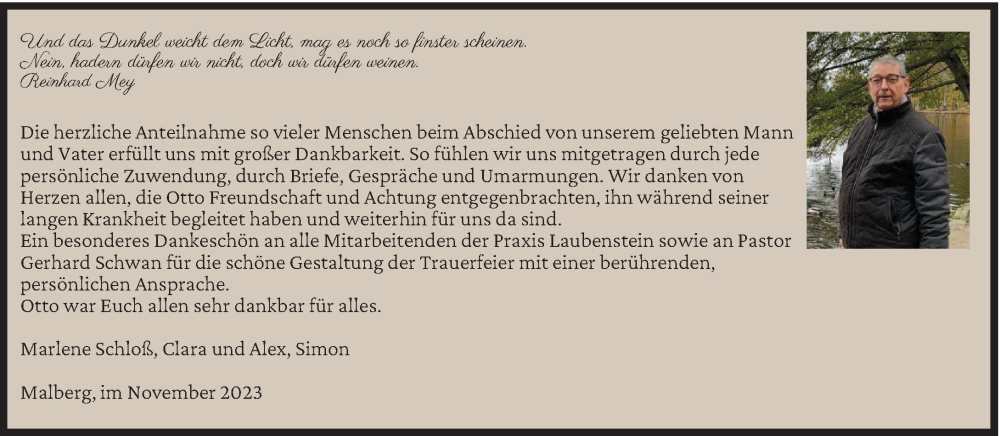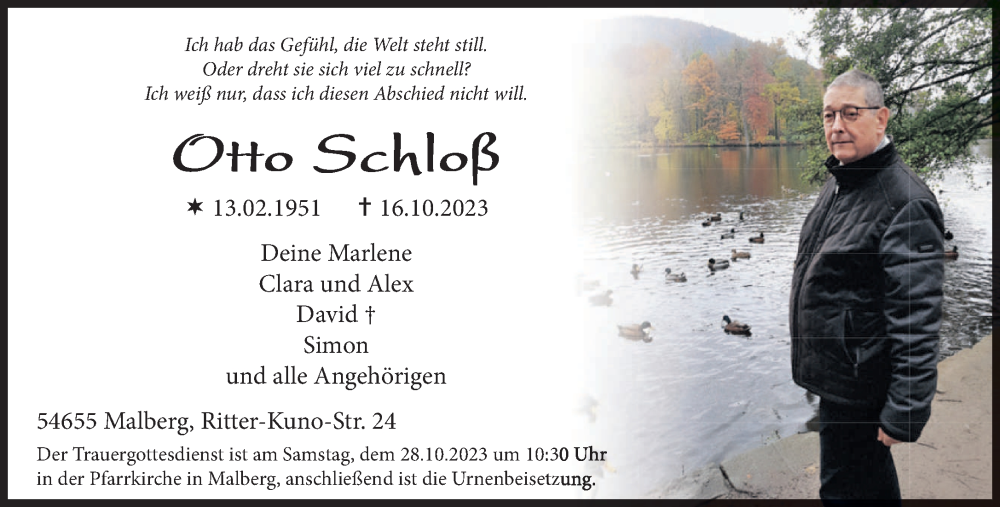 Hier finden Sie alle Traueranzeigen aus der Zeitung, die bisher für Otto Schloß erschienen sind. Weitere Traueranzeigen, die in der Zeitung erscheinen, werden hier ebenfalls aufgelistet