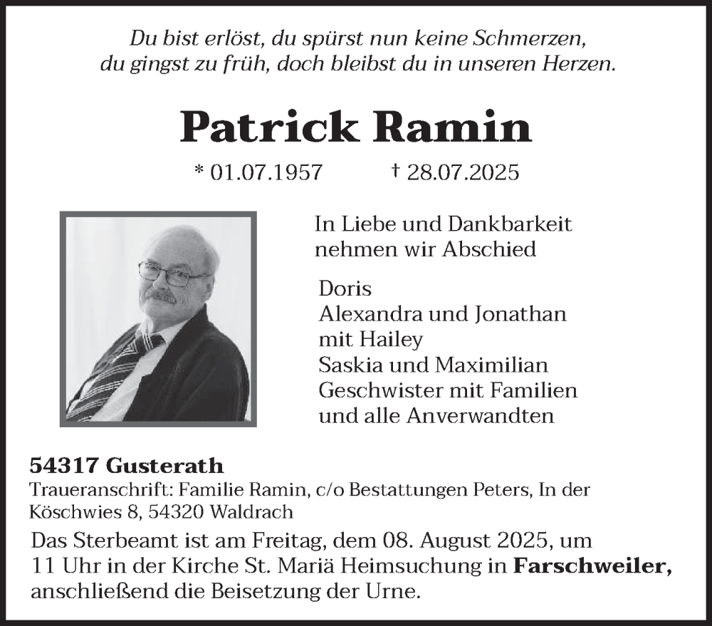 Hier finden Sie alle Traueranzeigen aus der Zeitung, die bisher für Patrick Ramin erschienen sind. Weitere Traueranzeigen, die in der Zeitung erscheinen, werden hier ebenfalls aufgelistet