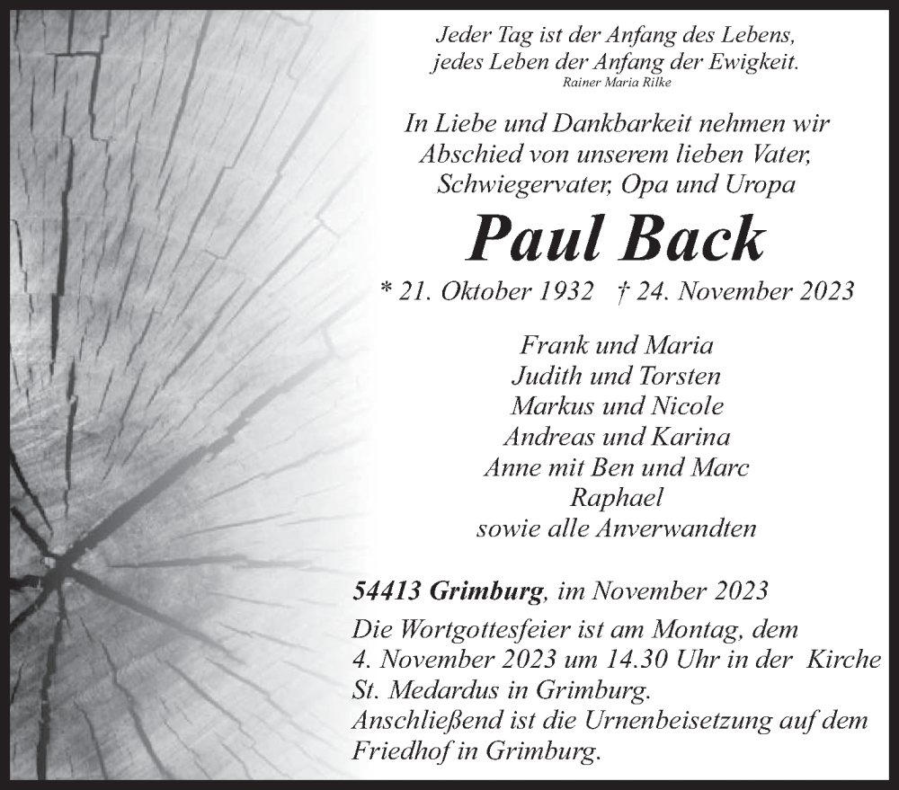Hier finden Sie alle Traueranzeigen aus der Zeitung, die bisher für Paul Back erschienen sind. Weitere Traueranzeigen, die in der Zeitung erscheinen, werden hier ebenfalls aufgelistet