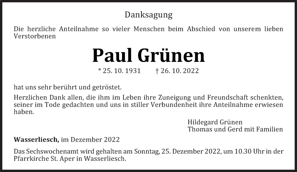 Hier finden Sie alle Traueranzeigen aus der Zeitung, die bisher für Paul Grünen erschienen sind. Weitere Traueranzeigen, die in der Zeitung erscheinen, werden hier ebenfalls aufgelistet