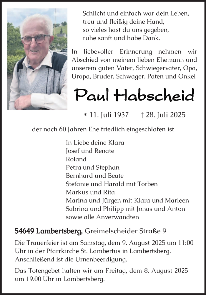 Hier finden Sie alle Traueranzeigen aus der Zeitung, die bisher für Paul Habscheid erschienen sind. Weitere Traueranzeigen, die in der Zeitung erscheinen, werden hier ebenfalls aufgelistet