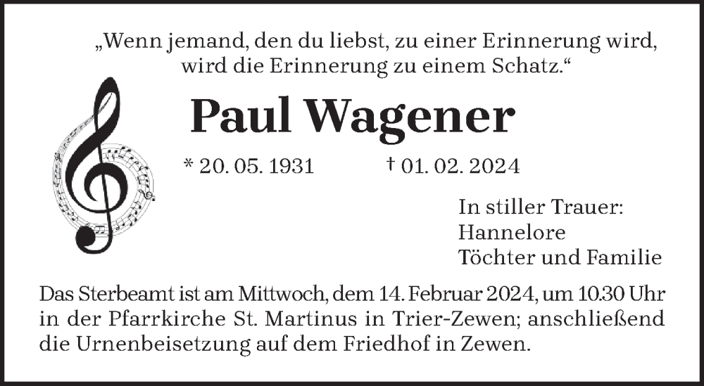 Hier finden Sie alle Traueranzeigen aus der Zeitung, die bisher für Paul Wagener erschienen sind. Weitere Traueranzeigen, die in der Zeitung erscheinen, werden hier ebenfalls aufgelistet