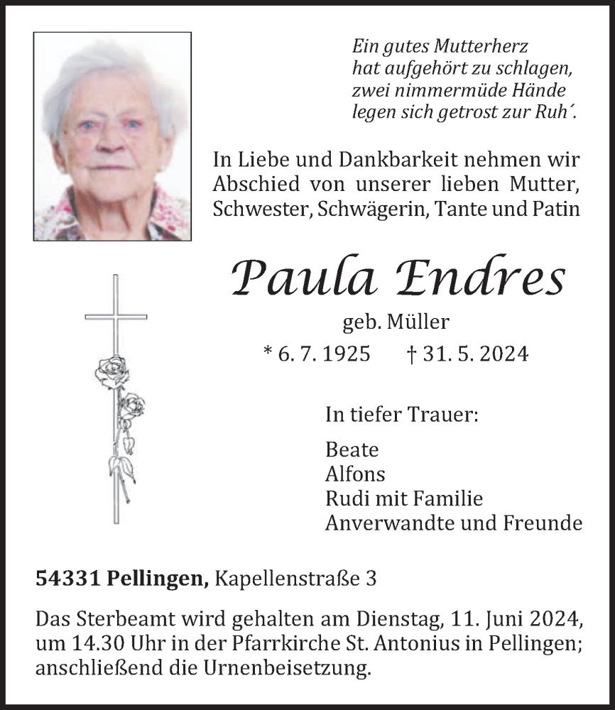 Hier finden Sie alle Traueranzeigen aus der Zeitung, die bisher für Paula Endres erschienen sind. Weitere Traueranzeigen, die in der Zeitung erscheinen, werden hier ebenfalls aufgelistet