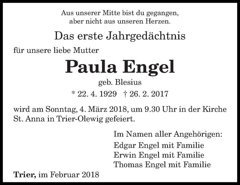 Hier finden Sie alle Traueranzeigen aus der Zeitung, die bisher für Paula Engel erschienen sind. Weitere Traueranzeigen, die in der Zeitung erscheinen, werden hier ebenfalls aufgelistet