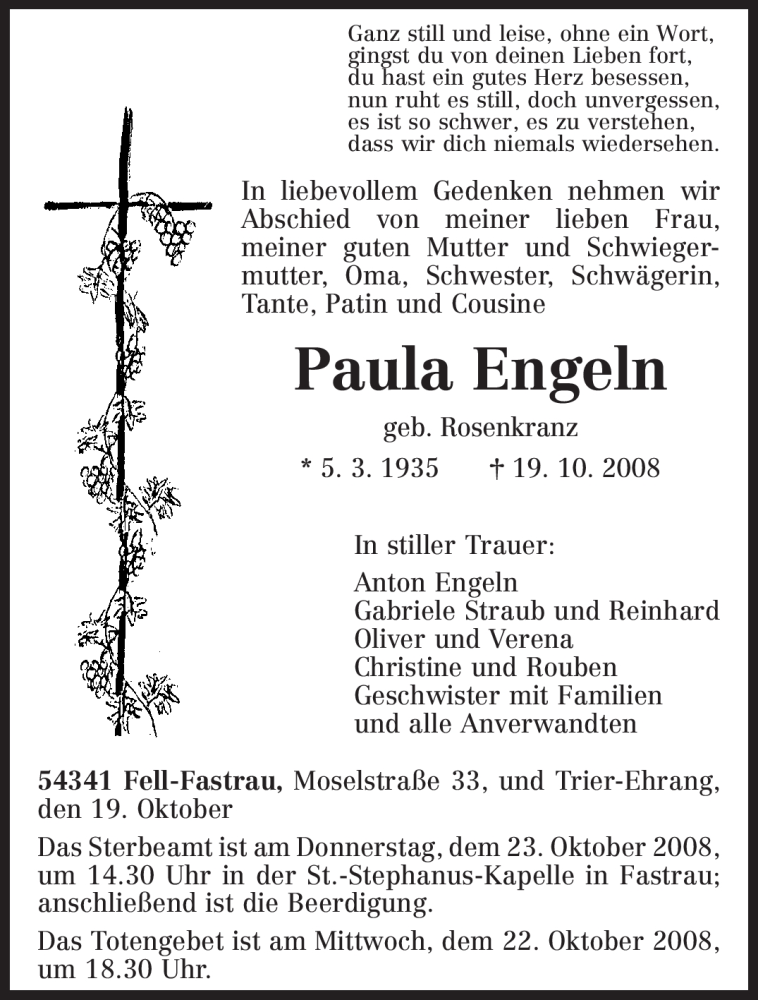 Hier finden Sie alle Traueranzeigen aus der Zeitung, die bisher für Paula Engeln erschienen sind. Weitere Traueranzeigen, die in der Zeitung erscheinen, werden hier ebenfalls aufgelistet