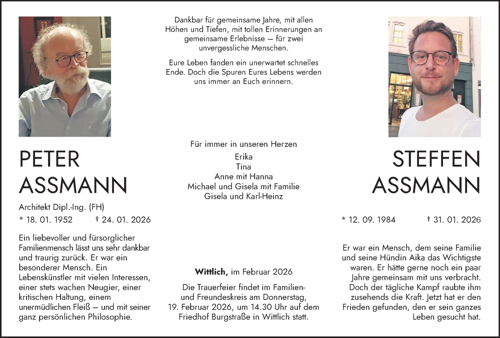 Hier finden Sie alle Traueranzeigen aus der Zeitung, die bisher für Peter Assmann erschienen sind. Weitere Traueranzeigen, die in der Zeitung erscheinen, werden hier ebenfalls aufgelistet