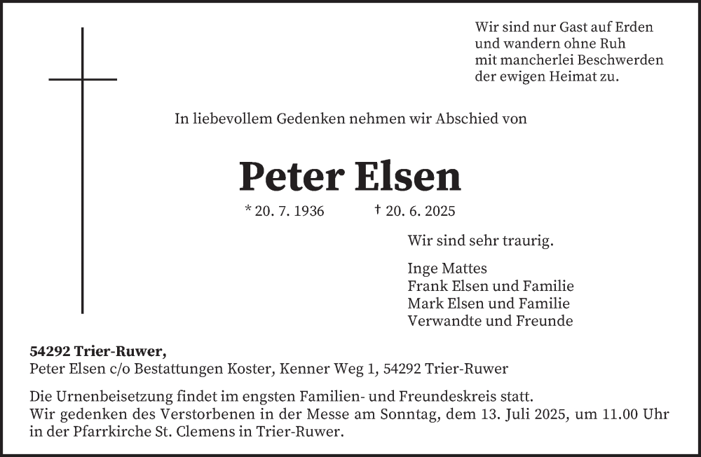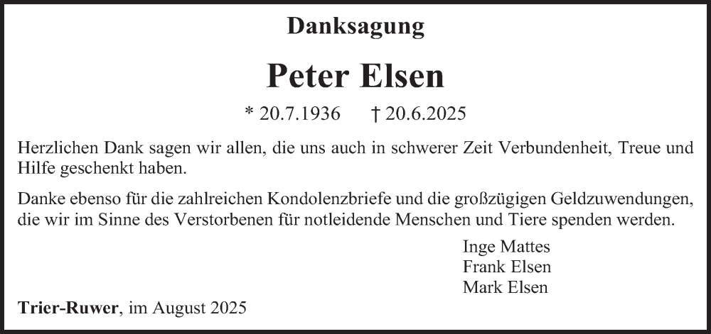 Hier finden Sie alle Traueranzeigen aus der Zeitung, die bisher für Peter Elsen erschienen sind. Weitere Traueranzeigen, die in der Zeitung erscheinen, werden hier ebenfalls aufgelistet