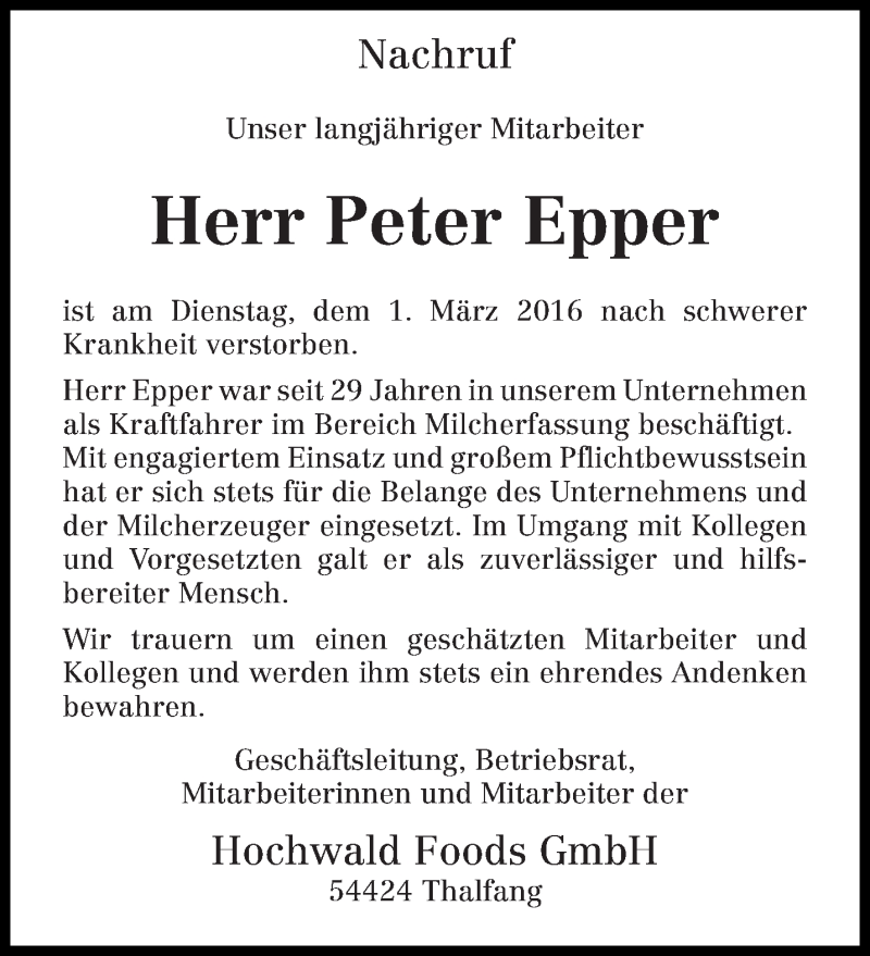 Hier finden Sie alle Traueranzeigen aus der Zeitung, die bisher für Peter Epper erschienen sind. Weitere Traueranzeigen, die in der Zeitung erscheinen, werden hier ebenfalls aufgelistet