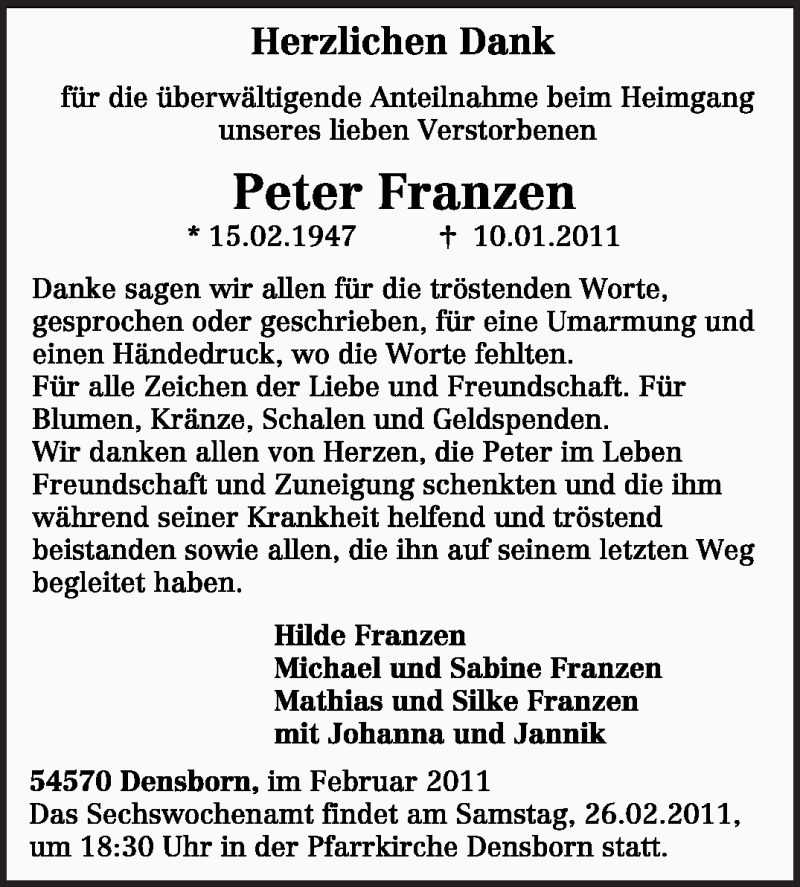 Hier finden Sie alle Traueranzeigen aus der Zeitung, die bisher für Peter Franzen erschienen sind. Weitere Traueranzeigen, die in der Zeitung erscheinen, werden hier ebenfalls aufgelistet
