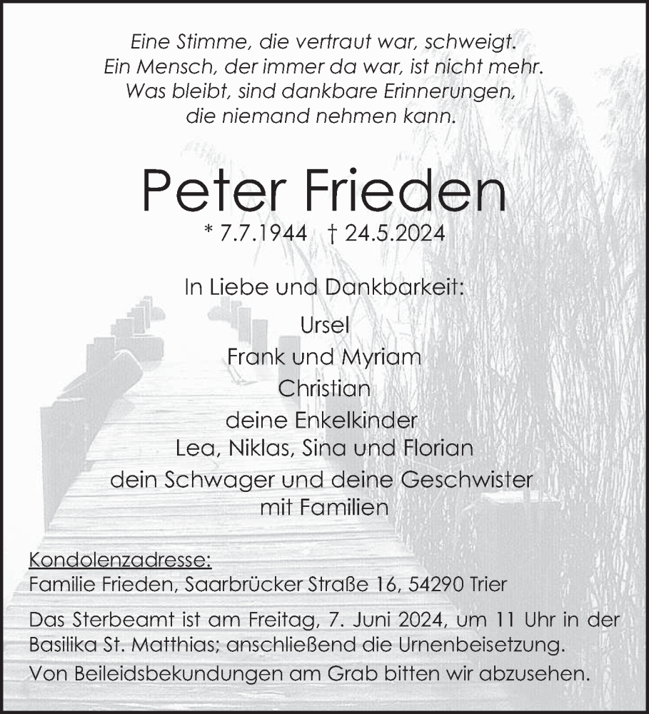 Hier finden Sie alle Traueranzeigen aus der Zeitung, die bisher für Peter Frieden erschienen sind. Weitere Traueranzeigen, die in der Zeitung erscheinen, werden hier ebenfalls aufgelistet