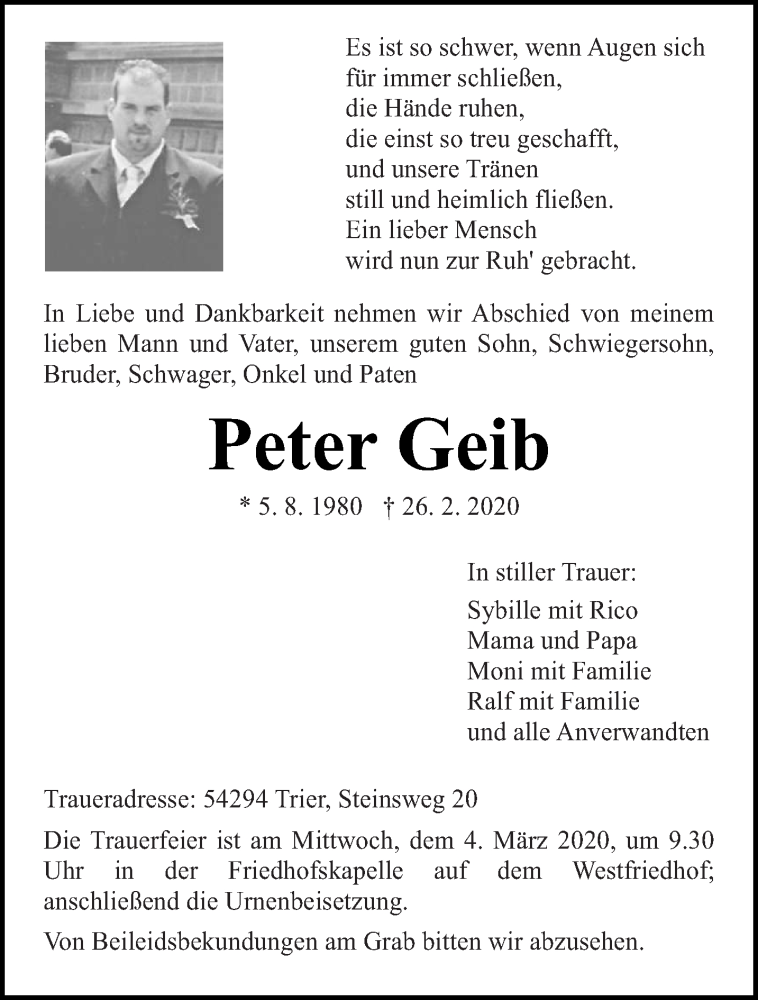 Hier finden Sie alle Traueranzeigen aus der Zeitung, die bisher für Peter Geib erschienen sind. Weitere Traueranzeigen, die in der Zeitung erscheinen, werden hier ebenfalls aufgelistet