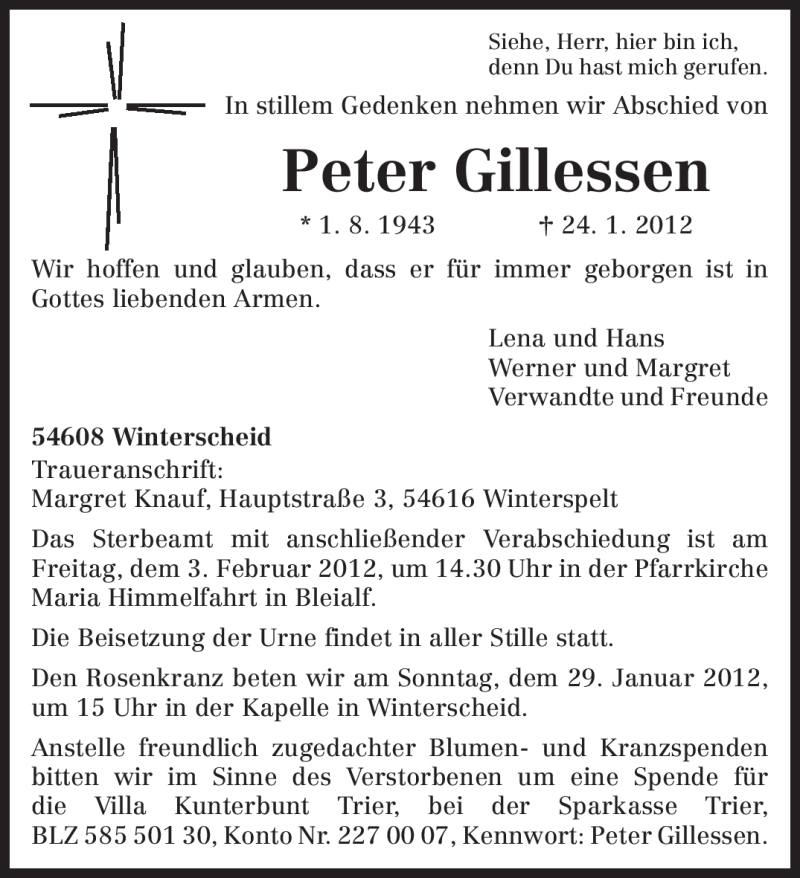 Hier finden Sie alle Traueranzeigen aus der Zeitung, die bisher für Peter Gillessen erschienen sind. Weitere Traueranzeigen, die in der Zeitung erscheinen, werden hier ebenfalls aufgelistet