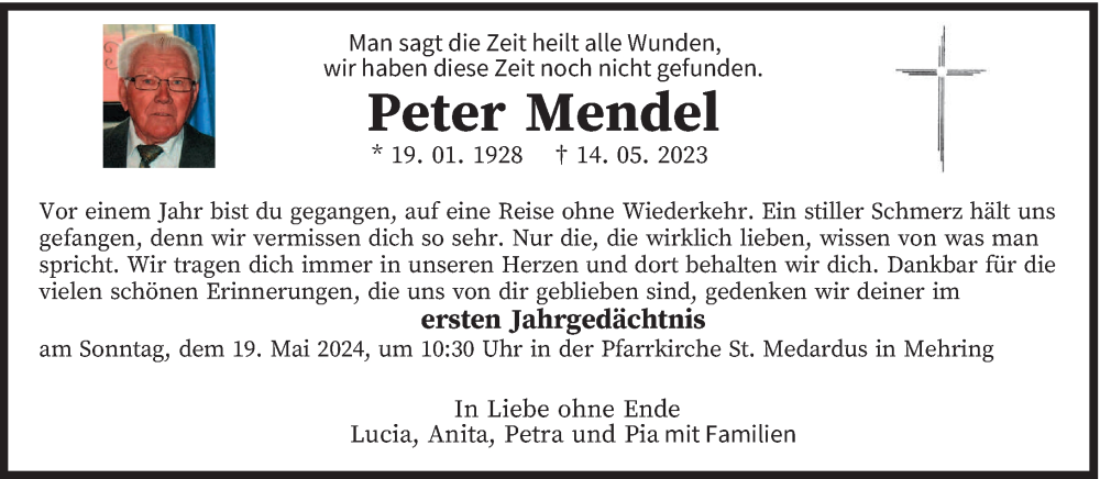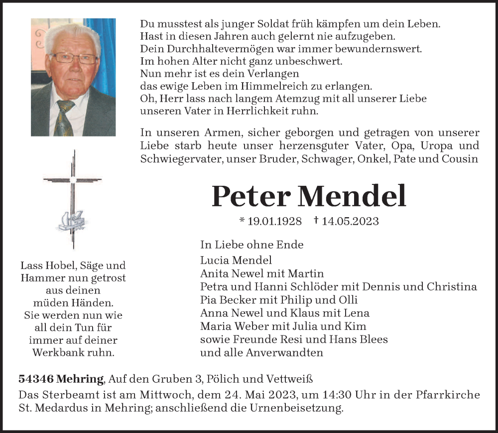Hier finden Sie alle Traueranzeigen aus der Zeitung, die bisher für Peter Mendel erschienen sind. Weitere Traueranzeigen, die in der Zeitung erscheinen, werden hier ebenfalls aufgelistet