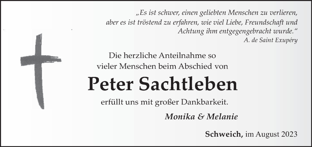 Hier finden Sie alle Traueranzeigen aus der Zeitung, die bisher für Peter Sachtleben erschienen sind. Weitere Traueranzeigen, die in der Zeitung erscheinen, werden hier ebenfalls aufgelistet
