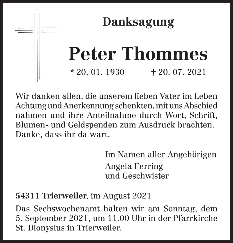 Hier finden Sie alle Traueranzeigen aus der Zeitung, die bisher für Peter Thommes erschienen sind. Weitere Traueranzeigen, die in der Zeitung erscheinen, werden hier ebenfalls aufgelistet