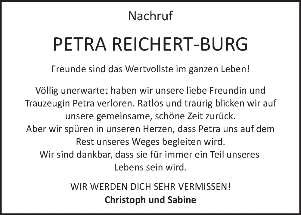 Hier finden Sie alle Traueranzeigen aus der Zeitung, die bisher für Petra Reichert-Burg erschienen sind. Weitere Traueranzeigen, die in der Zeitung erscheinen, werden hier ebenfalls aufgelistet