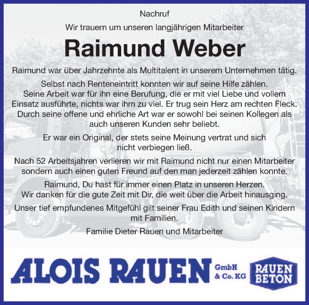 Hier finden Sie alle Traueranzeigen aus der Zeitung, die bisher für Raimund Weber erschienen sind. Weitere Traueranzeigen, die in der Zeitung erscheinen, werden hier ebenfalls aufgelistet