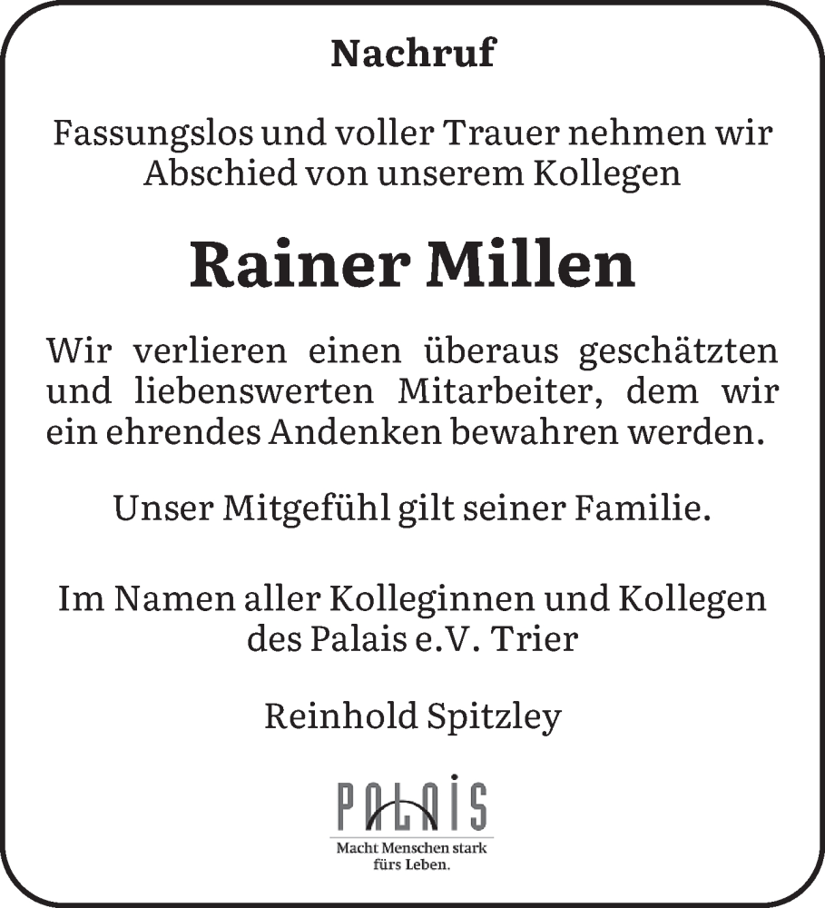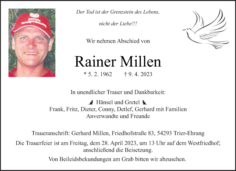 Hier finden Sie alle Traueranzeigen aus der Zeitung, die bisher für Rainer Millen erschienen sind. Weitere Traueranzeigen, die in der Zeitung erscheinen, werden hier ebenfalls aufgelistet
