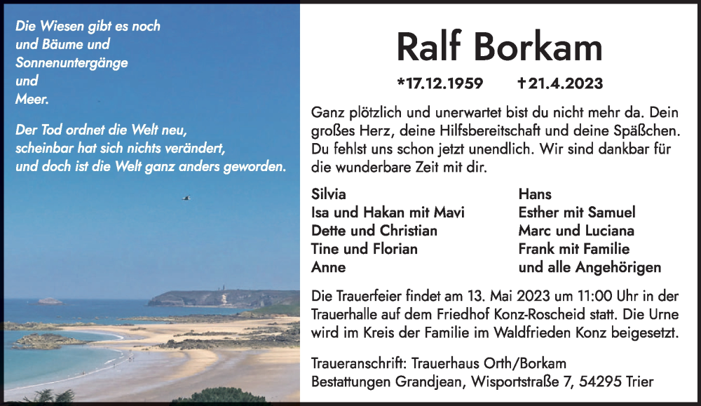 Hier finden Sie alle Traueranzeigen aus der Zeitung, die bisher für Ralf Borkam erschienen sind. Weitere Traueranzeigen, die in der Zeitung erscheinen, werden hier ebenfalls aufgelistet