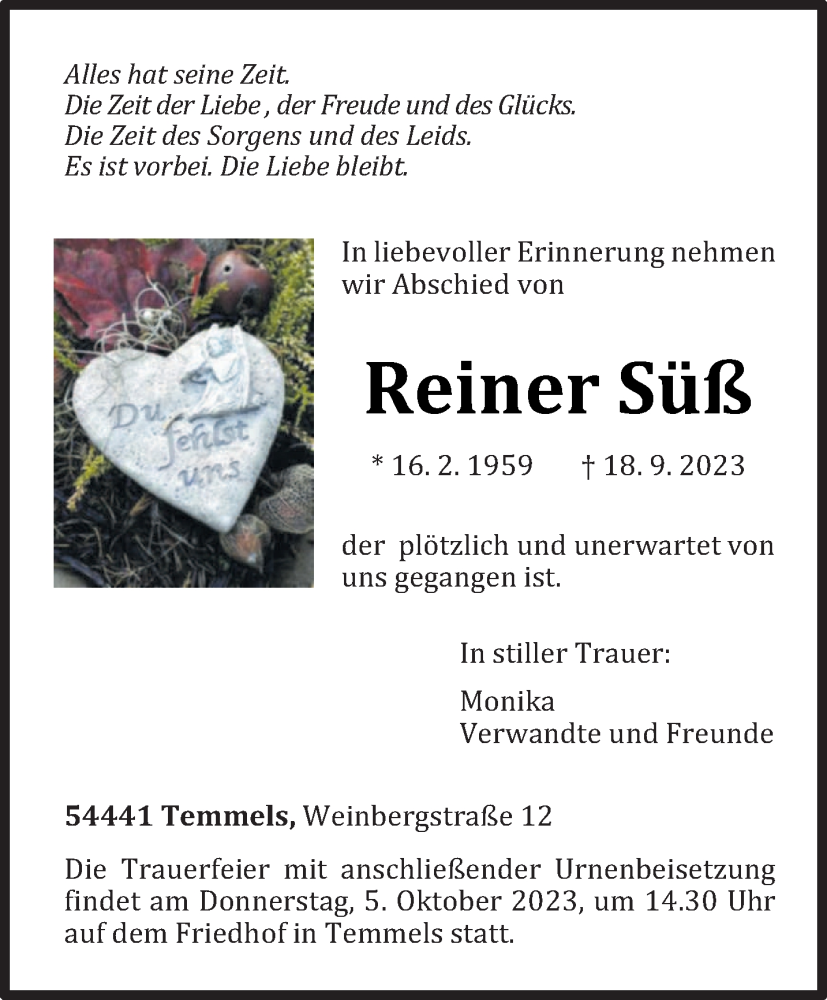 Hier finden Sie alle Traueranzeigen aus der Zeitung, die bisher für Reiner Süß erschienen sind. Weitere Traueranzeigen, die in der Zeitung erscheinen, werden hier ebenfalls aufgelistet
