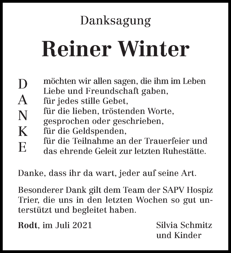 Hier finden Sie alle Traueranzeigen aus der Zeitung, die bisher für Reiner Winter erschienen sind. Weitere Traueranzeigen, die in der Zeitung erscheinen, werden hier ebenfalls aufgelistet