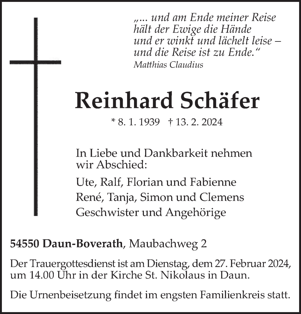 Hier finden Sie alle Traueranzeigen aus der Zeitung, die bisher für Reinhard Schäfer erschienen sind. Weitere Traueranzeigen, die in der Zeitung erscheinen, werden hier ebenfalls aufgelistet