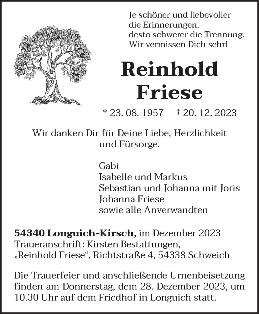 Hier finden Sie alle Traueranzeigen aus der Zeitung, die bisher für Reinhold Friese erschienen sind. Weitere Traueranzeigen, die in der Zeitung erscheinen, werden hier ebenfalls aufgelistet