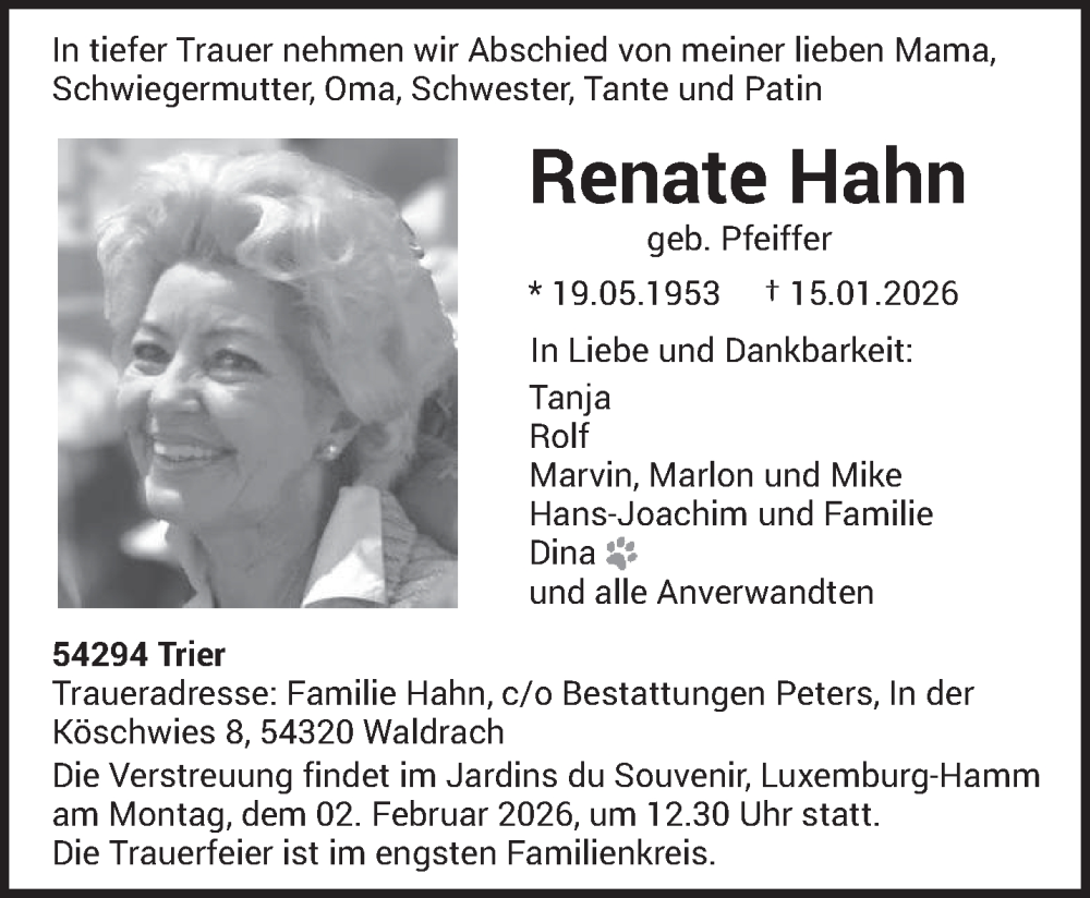 Hier finden Sie alle Traueranzeigen aus der Zeitung, die bisher für Renate Hahn erschienen sind. Weitere Traueranzeigen, die in der Zeitung erscheinen, werden hier ebenfalls aufgelistet