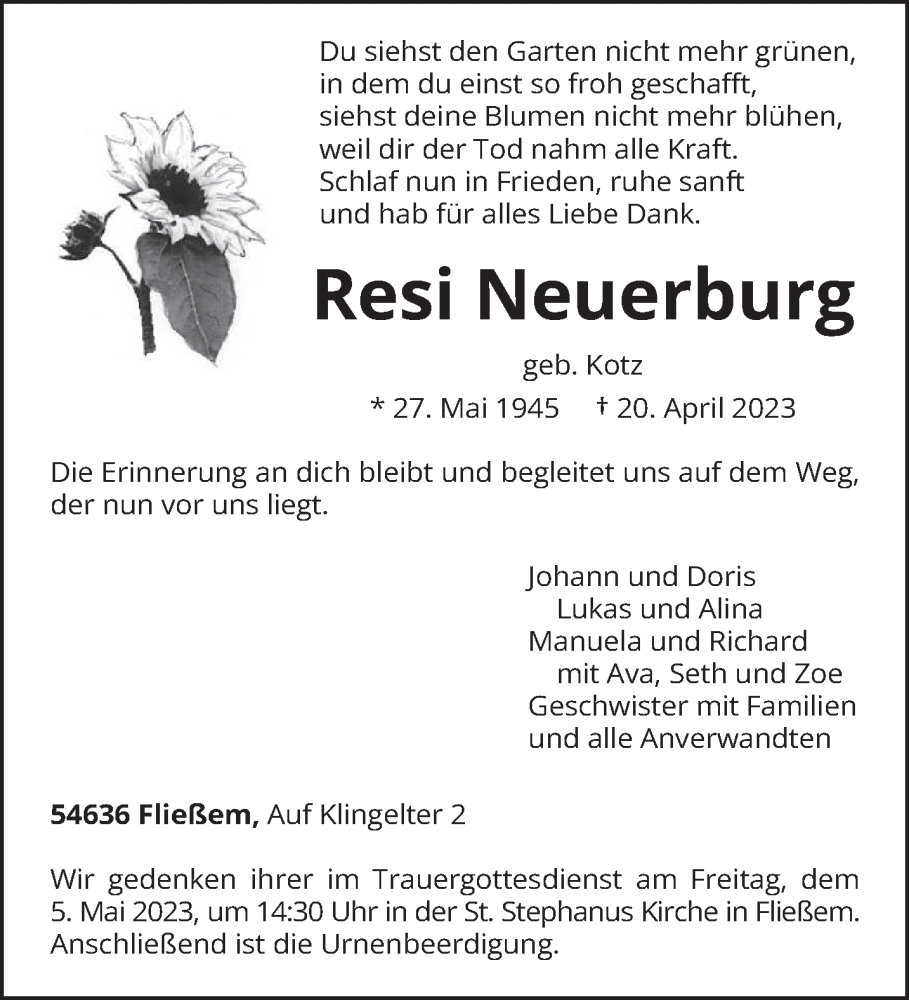 Hier finden Sie alle Traueranzeigen aus der Zeitung, die bisher für Resi Neuerburg erschienen sind. Weitere Traueranzeigen, die in der Zeitung erscheinen, werden hier ebenfalls aufgelistet